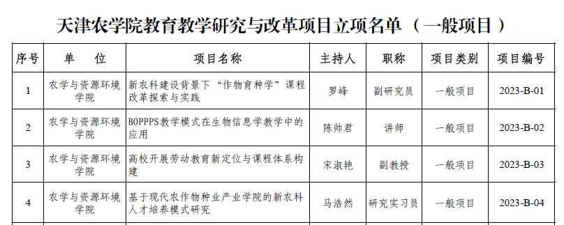 农学与资源环境学院2024年本科教育教学研究与改革领域又迎来新的喜讯。继2023年获批市级教改重点项目1项,市级教改一般项目1项之后,2024年初公布了2023年下半年申报的天津农学院本科教育教学研究与改革项目立项情况,我院获批重点项目2项、一般项目4项。