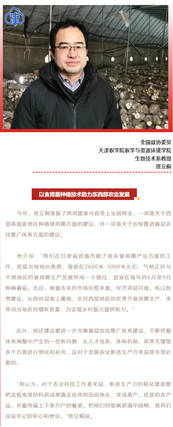 2024年3月4日,津门教育公众号报道全国政协委员、我校农学与资源环境学院班立桐教授准备了两项提案内容带上全国两会,一项是关于西部高海拔地区种植食用菌方面的建议,另一项是关于加快推进基层农技推广体系方面的建议。