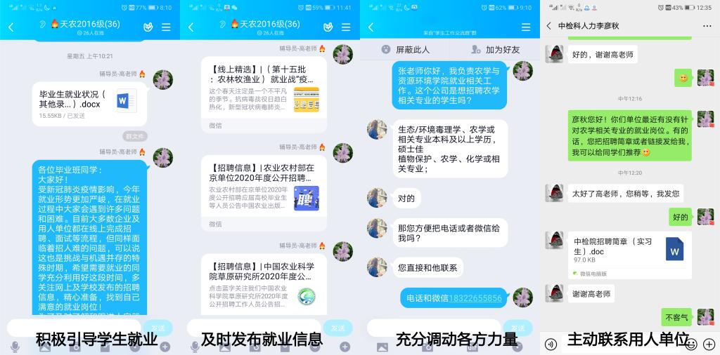 积极宣传,开启就业指导。农学与资源环境学院建立从“年级到专业”的就业信息分享群,为毕业生分享就业相关政策信息、就业指导课程、就业心理辅导、求职技能及就业招聘信息等资源;同时,学院还积极引导毕业学生随时关注“天农微就业”、“CAU就业”、“24365校园联合招聘”等各类就业公众号和就业网站上的信息,让同学们抓住一切机会充分就业。