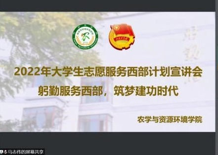 5月19日,农学与资源环境学院团委以腾讯会议形式举办了“躬勤服务西部 筑梦建功时代”大学生志愿服务西部计划宣讲会,会议邀请2021届毕业生中参加西部计划的志愿者王劲男、尹亚楠两位同学进行宣讲。