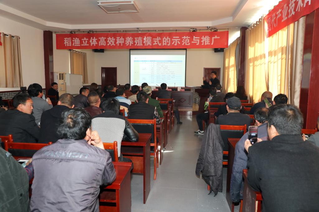 天津市水产产业技术体系创新团队首席专家邢克智教授、天津市科技局社会发展与农村科技处处长单光瑞、宝坻区科技局局长杨文胜、天津农学院谢晓东研究员、周文礼教授等出席会议。天津市水稻产业技术体系、天津市水产产业技术体系、帮扶团队成员、部分帮扶村种养殖户代表共100余人参加会议。