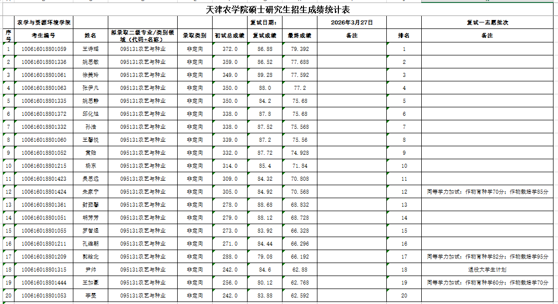 -天津农学院农学与资源环境学院2026年硕士研究生招生复试一志愿成绩