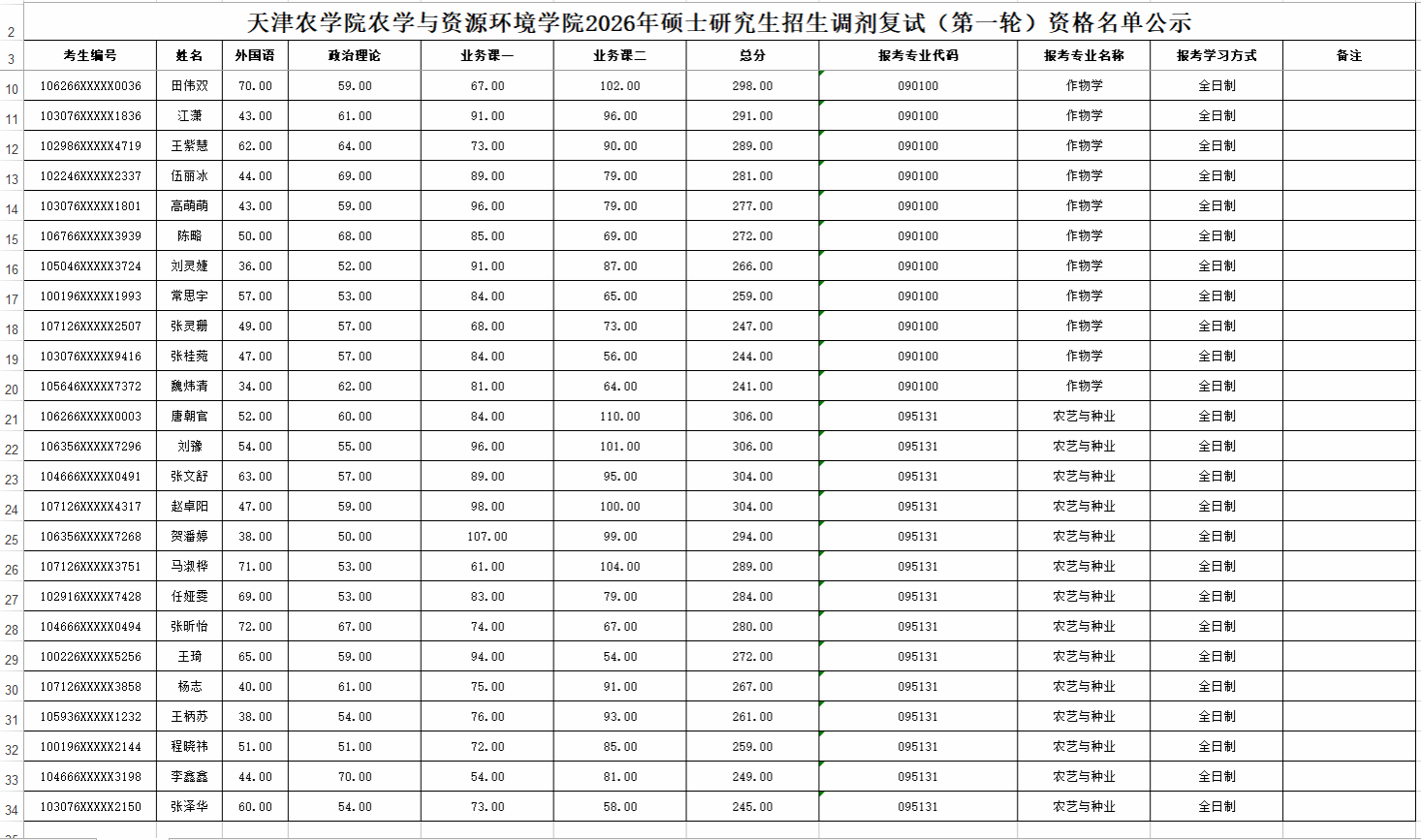 -天津农学院农学与资源环境学院2026年硕士研究生招生一志愿复试资格名单公示
