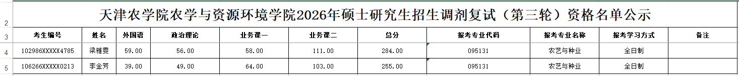 -天津农学院农学与资源环境学院2026年硕士研究生招生调剂复试(第三轮)资格名单公示